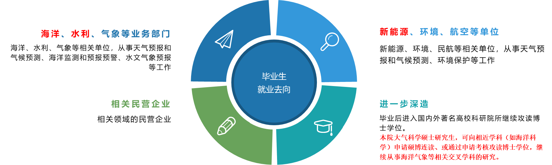 大气科学专业的毕业生可进入海洋、水利、气象等业务部分从事气象研究的相关工作,毕业生也可进入新能源、环境、航空等相关领域,从事与气象交叉的相关岗位。此外,按照黄瓜视频 硕博连读政策,在硕士第一年或第二年,学生可申请相近学科的硕博连读,继续在海洋气象领域深造。