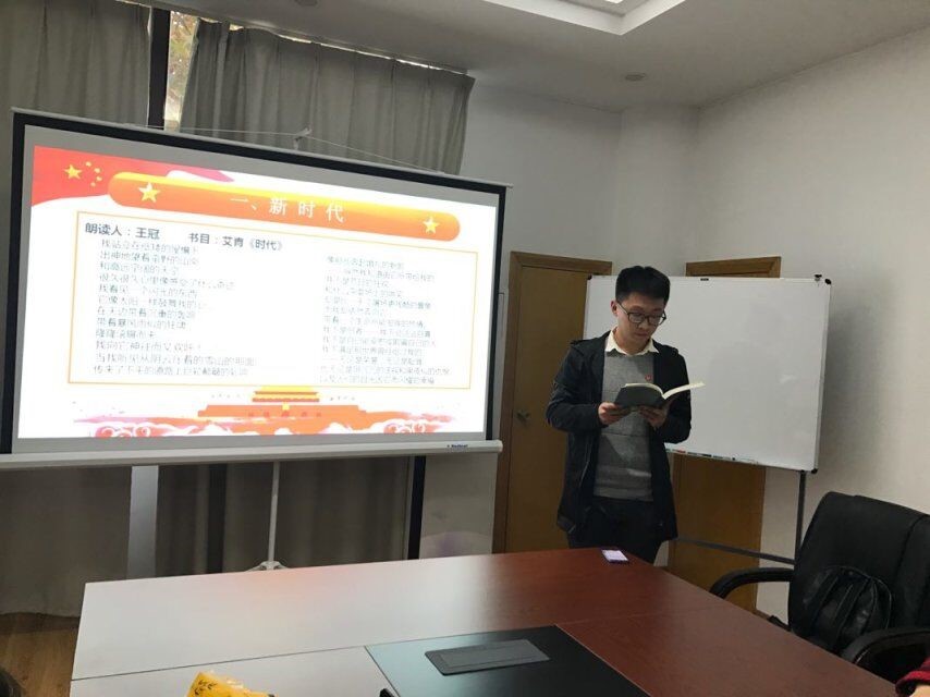 本次活动以“学习十九大精神”为主题,分为“新时代”、“强起来”、“新使命”、“新征程”、“青春梦”五个主旨部分。活动初,金老师和王书记分别分享了田华艺术家一段随笔、《平凡的世界》选段及《习近平的七年知青岁月》中关于读书学习的访谈语录;并表达了大家既要有平凡的心也要奋斗,要多读书,合理安排时间,全方面提高自身能力的希冀。紧接着本科生党支部安杰晶老师及8名支部党员分享了自己的选段,涵盖了书信、访谈、散文、诗词等类型。在之后的主持人采访时间,参与活动的成员各抒己见,结合自身的经历,表达了自己对十八大以来中国变化的感想以及对十九大精神的感悟。