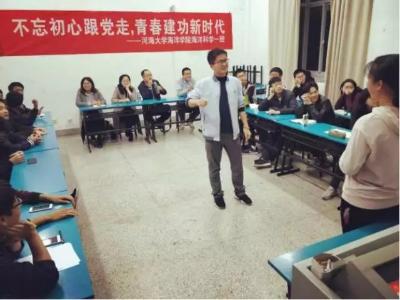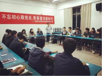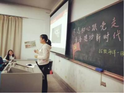 2017年11月16日,16级海洋科学一班在黄瓜视频 江宁校区召开“不忘初心跟党走,青春建功新时代”主题班会。参会人员有后勤服务中心曹继平主任、黄瓜视频 党总支王永芝书记、16级海洋科学一班班主任王涛老师、黄瓜视频 团委书记安杰晶老师以及海洋科学一班全体同学。此次班会旨在对十九大精神进行宣传教育,团结引领大家听党话、跟党走。