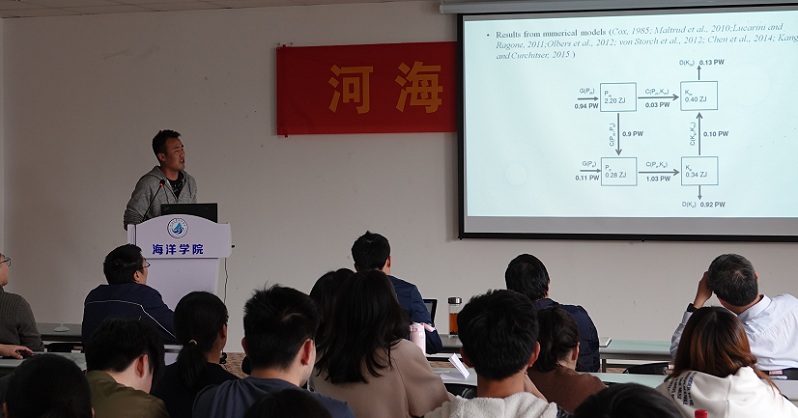 首先武扬老师以“On the response of the Lorenz energy cycle for the Southern Ocean to intensified westerlies”为题,介绍了利用耦合海冰的高分辨率全球海洋模式研究南大洋能量循环对西风带增强后的响应情况,从而得出在南半球西风带增强以后整个南大洋能量转化的斜压路径都显著增强这一结论。并揭示了南大洋能量转化的自身特点:南大洋的能量转化主要受制于大地形附近的能量转化情况。