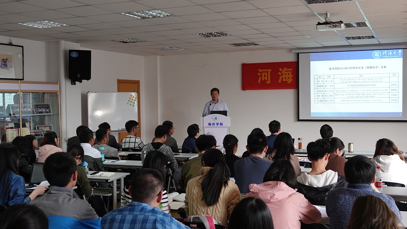 杨雅煜同学以“北极太平洋扇区温盐结构变化的初步研究”为题,阐述了北极海冰减少以后,楚科奇海域水团发生的显著变化及太平洋冬季水的年际变化等问题。陈佳佳同学以“Eddy generation mechanism in the central South China Sea”为题,利用卫星高度计的海面高度异常数据和非线性一层半约化重力模式,汇报了南海中部中尺度涡生成机制的研究进展。