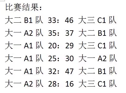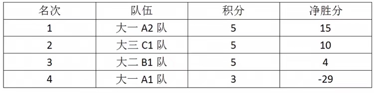 经过为期一周的激烈比赛,本次“海洋杯”篮球赛学生队伍之间的较量落下了帷幕。最终大一A2队(传奇巨星队,队员许岚祯、王炅鑫、姜佑捷、吴一鸣、李勋、杨瀚韬、汤皓、彭翌豪)凭借净胜分的优势夺得冠军,而大三C1队,大二B1队由于净胜分的劣势位居2,3名,大一A1队排在第四位。以下是本次比赛的赛果以及最终积分表。
