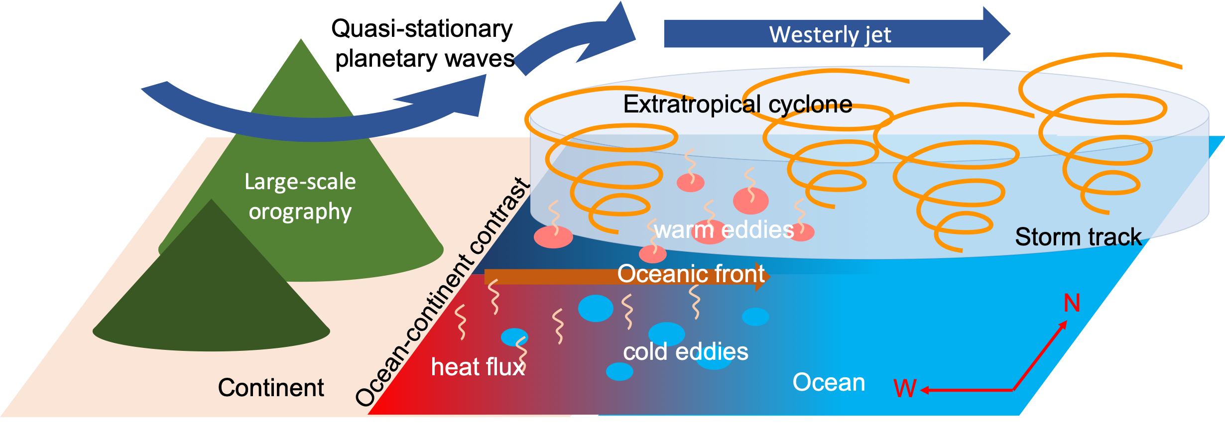 中纬度西边界流海域多尺度海气相互作用示意图