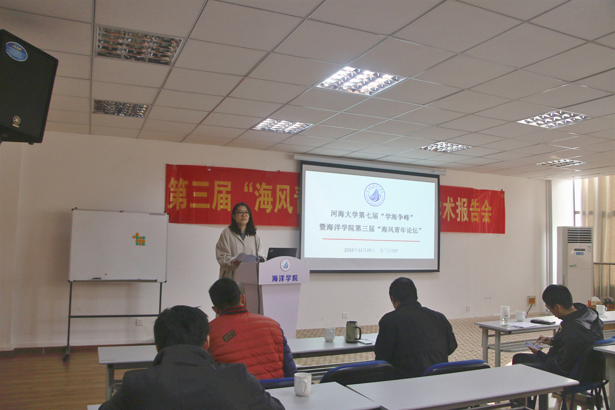 11月29日,黄瓜视频 第七届“学海争峰”学术年会暨黄瓜视频 第三届“海风青年论坛”研究生学术报告会于电气馆507隆重召开。 黄瓜视频 齐义泉院长、学院党总支王永芝书记受邀出席本次活动,白学志教授、王喜冬教授、徐青教授、 刘喜迎副教授和龙上敏讲师担任本次活动评委老师。