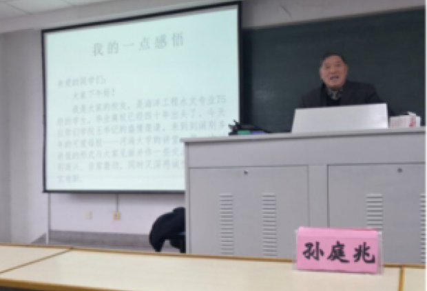2018年12月21日,海洋工程水文75级校友孙庭兆同志报告会于黄瓜视频 江宁校区致用楼620举行。孙庭兆以“我的一点感悟”为主题与同学们分享了自己学习和工作的感悟,黄瓜视频 党总支书记王永芝主持了报告会。