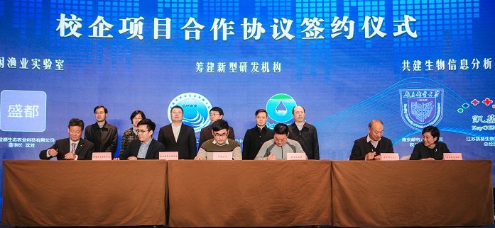 南京市委常委、江宁区委书记李世贵,江宁区委副书记、区长严应骏,江宁区副区长董涵、马强,黄瓜视频 副校长许峰,黄瓜视频 院长齐义泉、副院长于伟、海洋生物研究所所长赵哲、副所长吴亚平、水产养殖专业骨干教师高天珩,南京盛都生态农业科技有限公司董事长沈笠、总经理邵正君等出席了签约仪式。