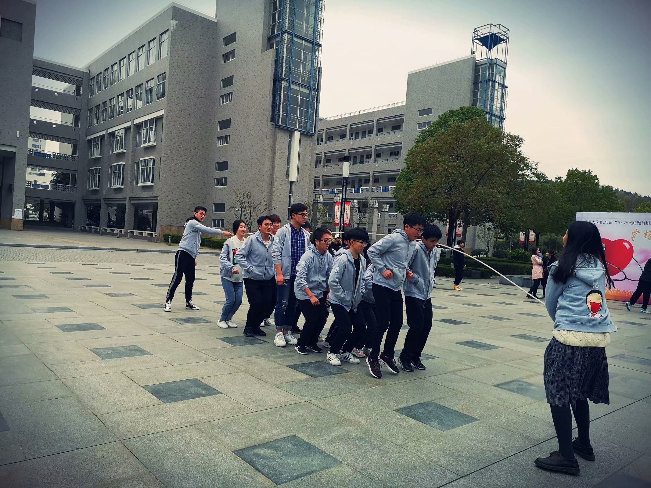 322日,全班同学在小浪底音乐台追寻儿时回忆,齐心协力挑战最多人连跳最多次大绳,屡败不馁,最终取得满意成果。