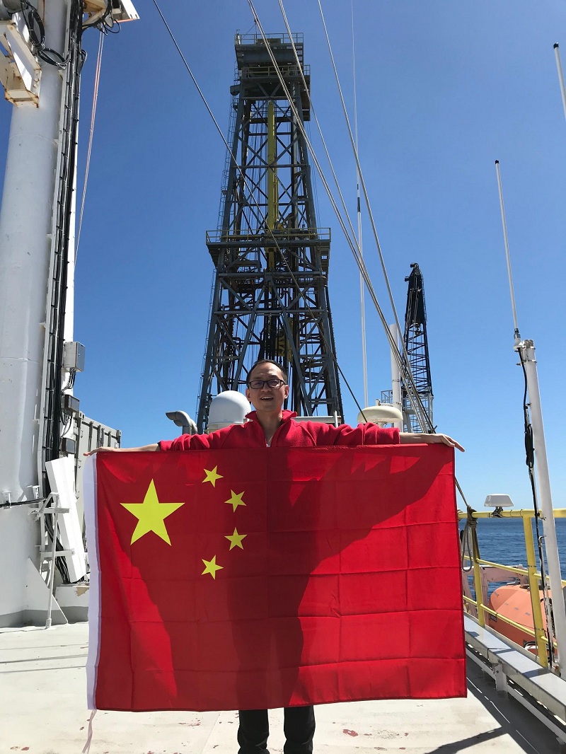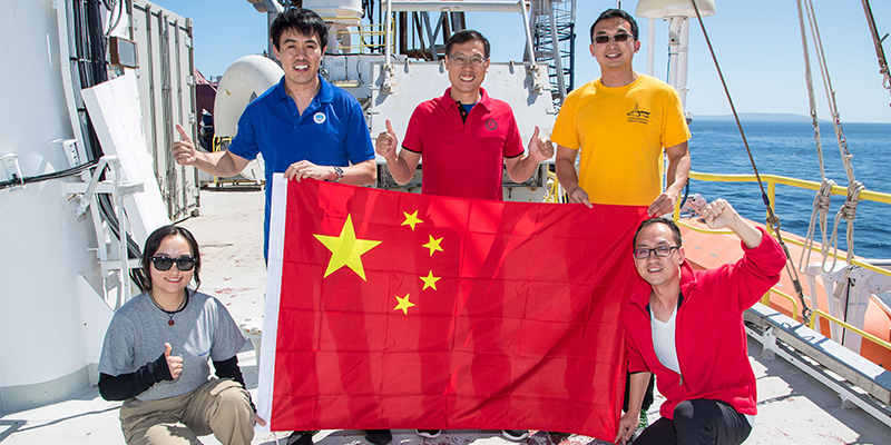 船上五位中国科学家在决心号上,与鲜红的五星红旗合影,庆祝祖国70周年华诞