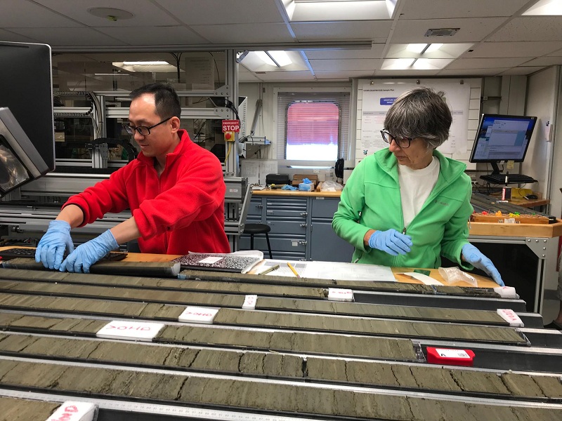 在实验室,与美国构造学家Joann Stock一起观察岩性