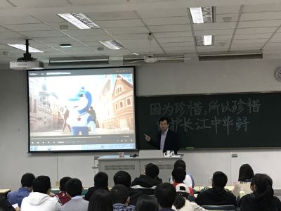 王丁研究员介绍了长江江豚的生活习性、濒危程度、对江豚采取的保护措施等,使师生认识江豚、了解江豚并鼓励人们参与到江豚保护中来。他指出长江江豚是长江里仅存的鲸类动物,国家一级保护动物,全世界仅存1000多头,比国宝大熊猫还要稀少,经过长期的努力,长江江豚保护技术体系已基本完备。长江江豚保护是“长江大保护”的有力抓手,王丁先生展望了长江江豚保护工作的未来前景,呼吁更多人参与其中,并说我们比历史上任何时期都更有信心,有能力打赢这场生态保护的硬仗。报告期间王丁博士还分享了很多他和同事在进行物种保护工作时的亲身经历。长江江豚的微笑一定能永远留在长江家园,长江也会迎来美好的明天。