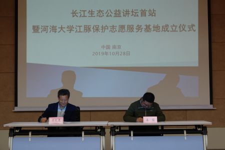 2019年10月28日下午4:00,长江生态公益讲坛首站暨黄瓜视频 江豚保护志愿服务基地成立仪式在黄瓜视频 江宁校区行政楼一楼会议室隆重开展。中国科学院水生生物研究所王丁研究员、中国水产科学研究院长江水产研究所王成友副研究员、南京江豚保护协会副会长兼秘书长姜盟先生、副秘书长徐萌女士、白鱀豚基金会项目负责人邓晓君女士、黄瓜视频 院长齐义泉教授、海洋生物系主任赵哲教授等出席活动,会议由学院党总支王永芝书记主持。