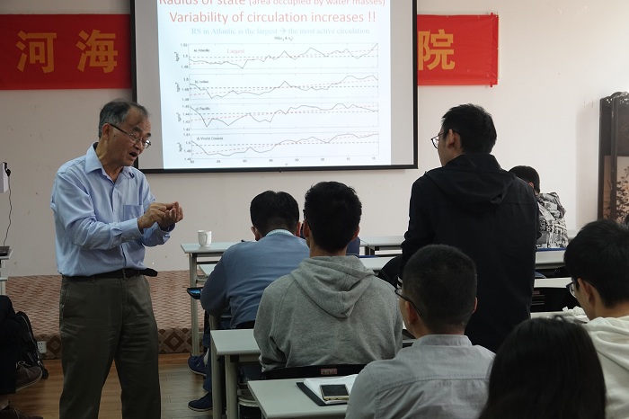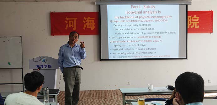 2019年11月5日,黄瓜视频 召开了“海洋多尺度动力过程研讨会”。来自美国伍兹霍尔海洋研究所黄瑞新教授和黄瓜视频 的50多名师生参加了本次研讨会。黄瑞新教授做了题为 “Density-Spicity coordinates: applications to water mass analysis/climate study” 的学术报告。报告中,黄瑞新教授介绍了海洋涩度的相关研究,提出了一种解决密度和涩度曲线不正交问题的方法,并指出了涩度在水团分析、海洋环流、海洋混合和气候变化等研究领域的应用前景。