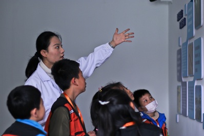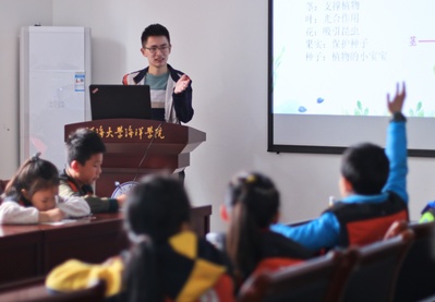 志愿者赵占伟为同学们讲解关于藻类和植物的科普知识,亲切的互动和活跃的提问充斥了整个小课堂。同学们都听得特别认真,期间讲解员还现场拿出了一些植物的叶子来教大家辨认。