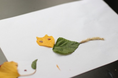 同学们以不同颜色和形态的植物叶子为材料,聚精会神地制作着生物画。