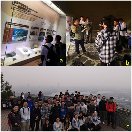图一 a.参观汤山直立人博物馆 b.王攀老师讲解葫芦洞溶洞 c.背靠玄武湖,紫金山顶合影留念