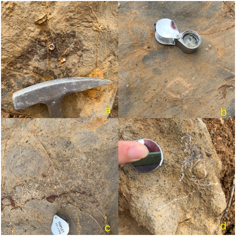 图三 金陵组灰岩中的生物化石a.海百合茎横切面 b. 珊瑚横切面 c.珊瑚骨架化石 d.珊瑚侧面