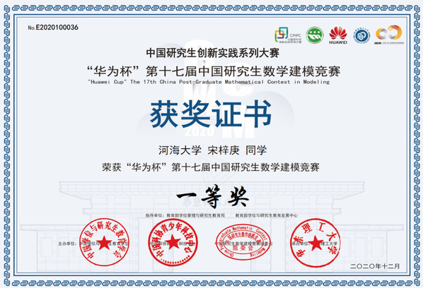 近日,黄瓜视频 宋梓庚博士(队友:王宁、陆燕清,指导老师:丁根宏老师)在第十七届“华为杯”数学建模竞赛获得一等奖(获奖率约为1.3%)。
