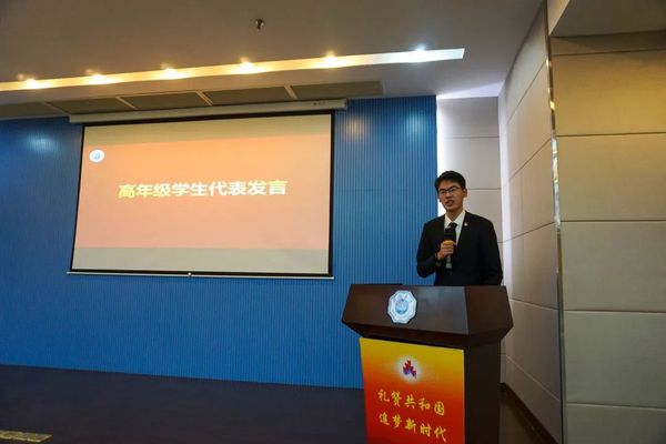 接下来高年级学生代表王潇翔同学发言。他与同学们分享了自己大学的体会和感悟,勇担使命、专注学习,热爱集体,积极健康、多彩生活,勇于挑战、笑对改变,同时更要胸怀包容与感恩之心。