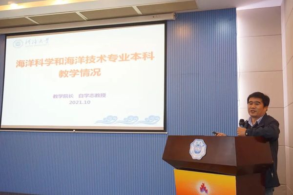 然后,白学志副院长介绍本科教学情况。简述了海洋科学专业和海洋技术专业,并介绍学院的师资力量、专业培养方案、学生课程框架、专业方向分流、导师制等内容,以及学校、学院的相关规定,让同学知道自己将要成为什么样的人。