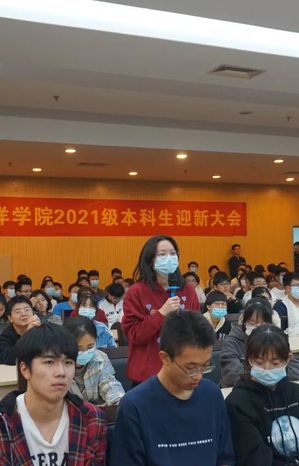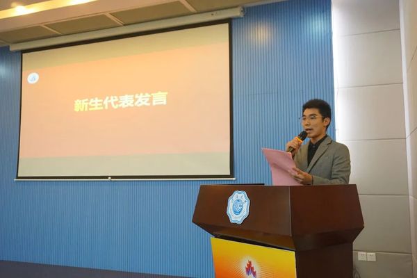 随后,新生代表娄函熙同学发言。他的发言文采飞扬、激情澎湃,讲述了从入学至今,一个多月以来对大学的感受,表达了对未来将要作出的积极改变,也许下了对大学美好的期待,不负韶华、只争朝夕!