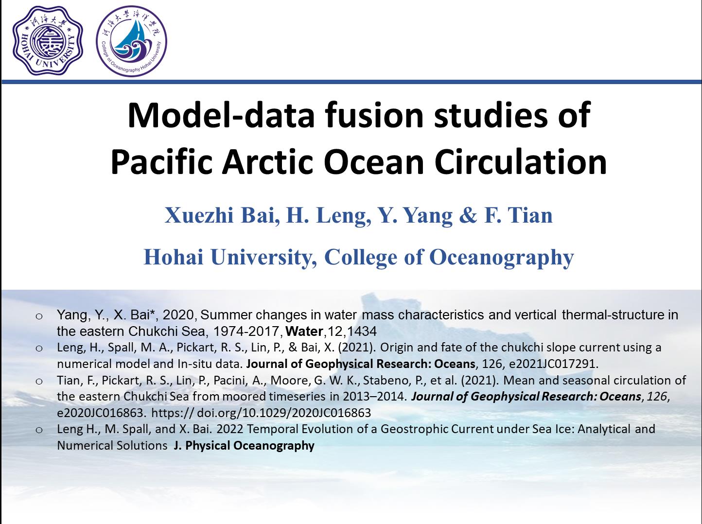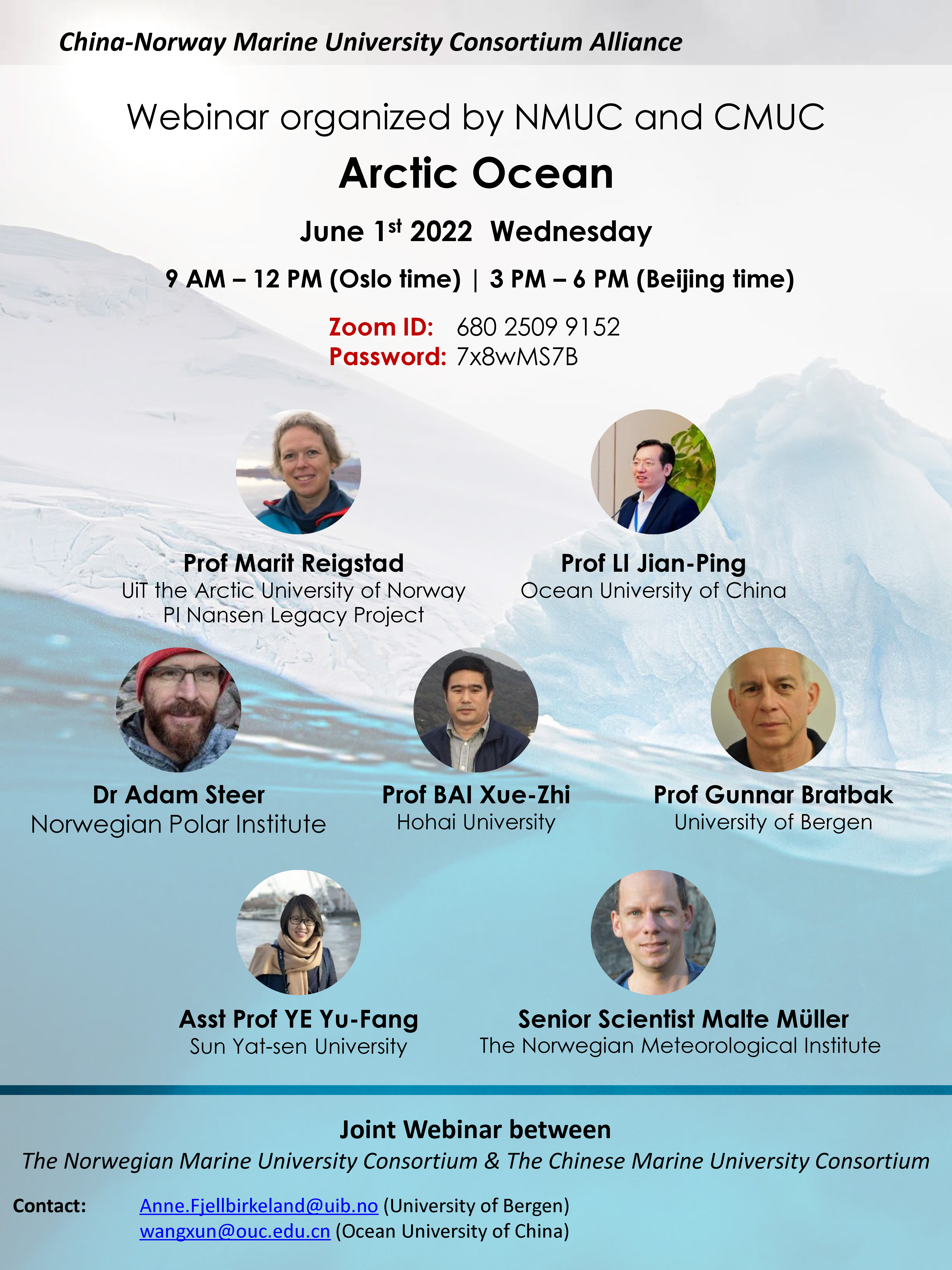 北京时间2022年6月1日15:00-18:00,中国-挪威海洋大学联盟第一次主题线上研讨会: Arctic Ocean于线上召开,会议邀请了多位国内外知名专家学者,黄瓜视频 白学志教授受邀参加并做了题为‘Model-data fusion studies of Pacific Arctic Ocean circulation’的学术报告。