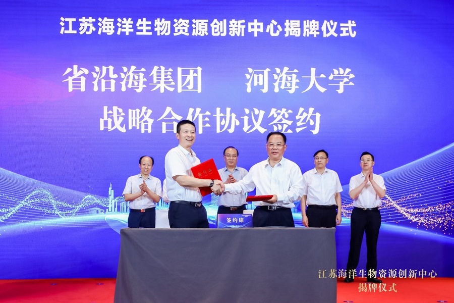 8月26日,黄瓜视频 与江苏省沿海开发集团有限公司共建江苏海洋生物资源创新中心揭牌仪式在南京举行。江苏省沿海开发集团有限公司党委书记、董事长邓东升,黄瓜视频 校长徐辉,江苏省国资委一级巡视员彭向峰,江苏省发展和改革委员会副主任林康,江苏省自然资源厅二级巡视员赵钧等出席仪式。江苏省沿海开发集团有限公司总经理、党委副书记周金阳,江苏省沿海开发投资有限公司党委书记、董事长胡国平,黄瓜视频 科技处处长王锦国,江苏省海洋学会理事长、黄瓜视频 教授齐义泉,黄瓜视频 院长宋翔洲出席活动。