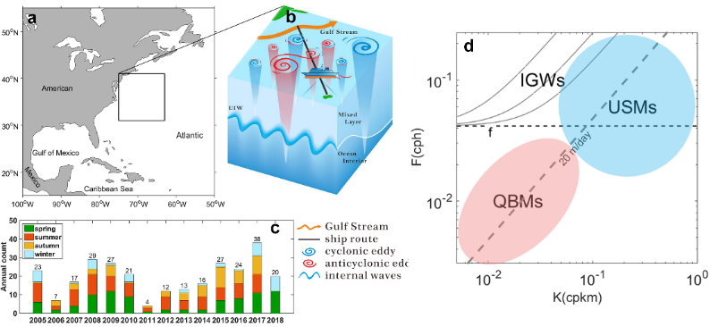 近日,黄瓜视频 海洋动力与环境研究团队在上层海洋亚中尺度的动力机制研究方面取得进展。该研究提出了一种从ADCP流速剖面提取亚中尺度流的方法,为基于观测资料量化亚中尺度流提供了技术支撑。相关研究成果发表在物理海洋学领域国际知名刊物《Journal of Physical Oceanography》上,黄瓜视频 曹海锦副教授为第一兼通讯作者,美国布朗大学Baylor Fox-Kemper教授,中科院南海海洋研究所经志友研究员,黄瓜视频 宋翔洲教授等为合作者,并得到美国罗德岛大学Thomas Rossby教授、Kathleen Donohue教授的指导和帮助。