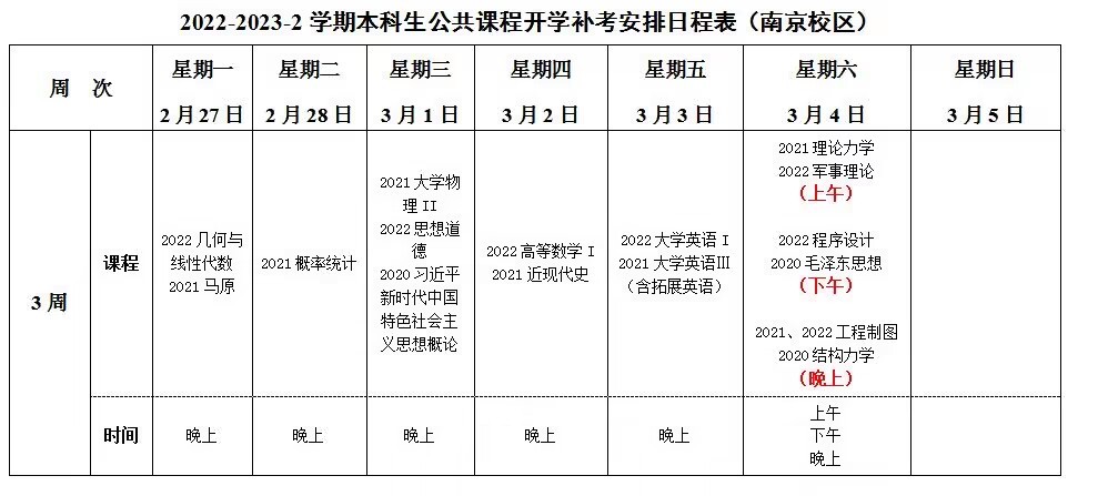 2022-2023-2学期公共课程开学补考日程安排