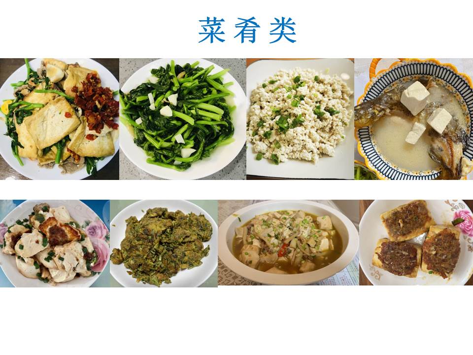 菜肴类:豆腐菜苔炒肉片(龙上敏)、素炒菜苔(龙上敏)、凉拌豆腐(陈美香)、昂刺鱼炖豆腐(夏思瑶)、酿豆腐(王亚苏)、香椿炒蛋(阮雪琴)、菌菇肉末豆腐煲(吴昊)、香煎酿豆腐(葛黎丽);