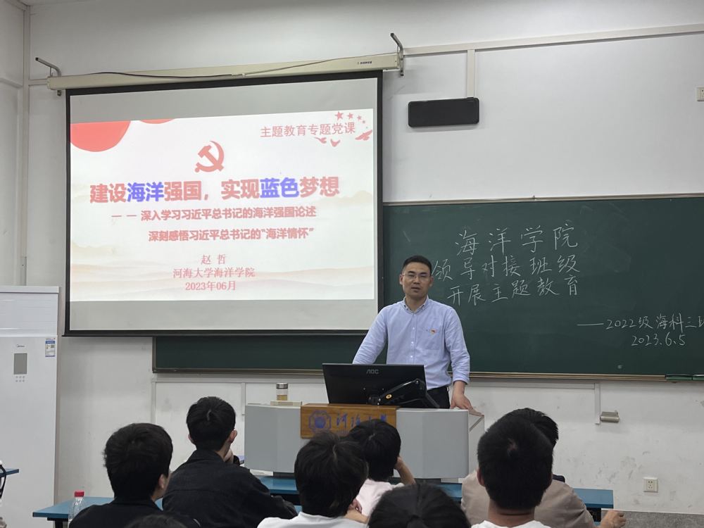 6月5日晚,赵哲副院长走进结对班级,为学生讲授题为“建设海洋强国,实现蓝色梦想”的主题教育专题党课,带领学生深入学习习近平总书记的海洋强国论述,深刻感悟习近平总书记的“海洋情怀”。