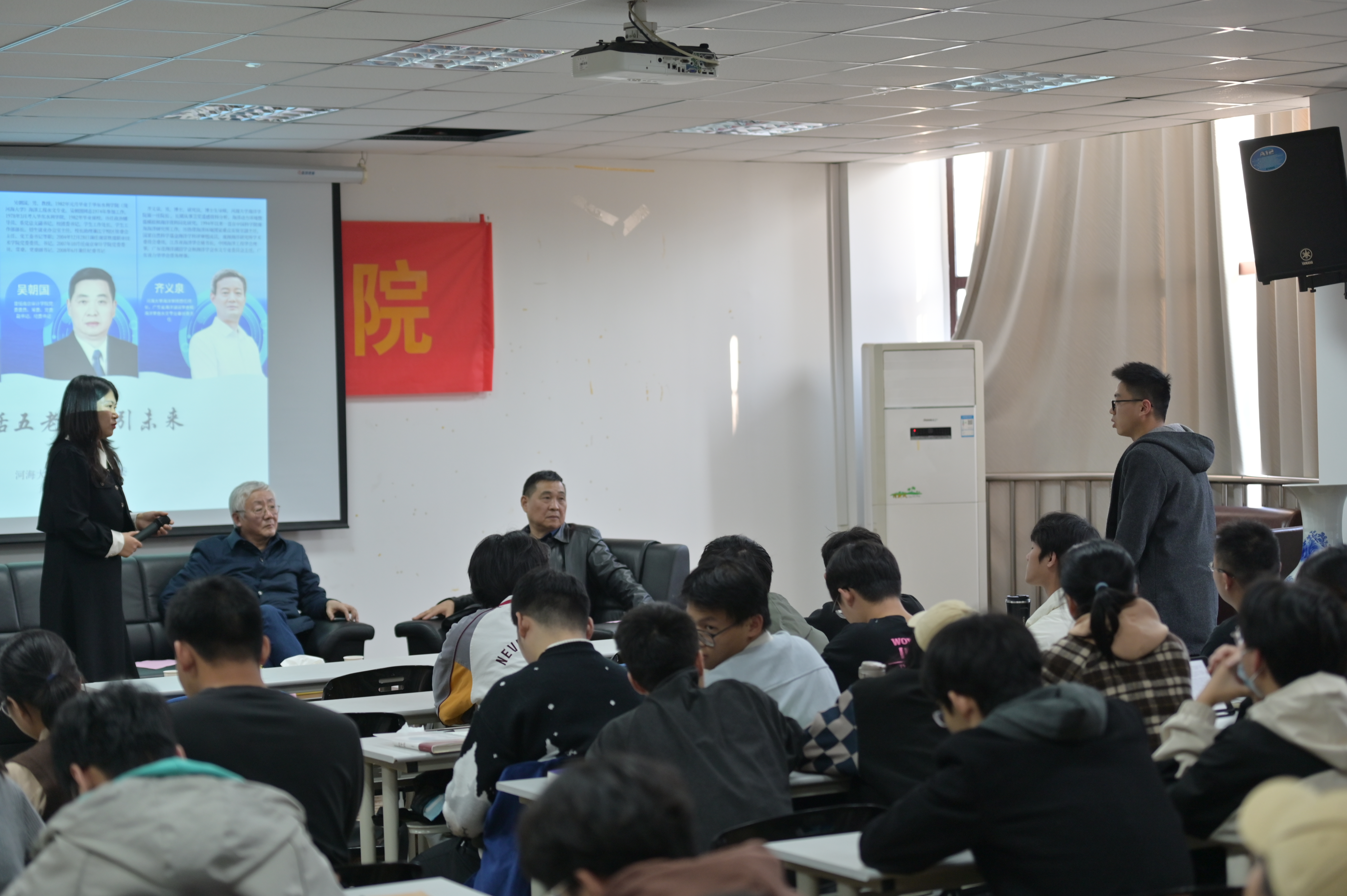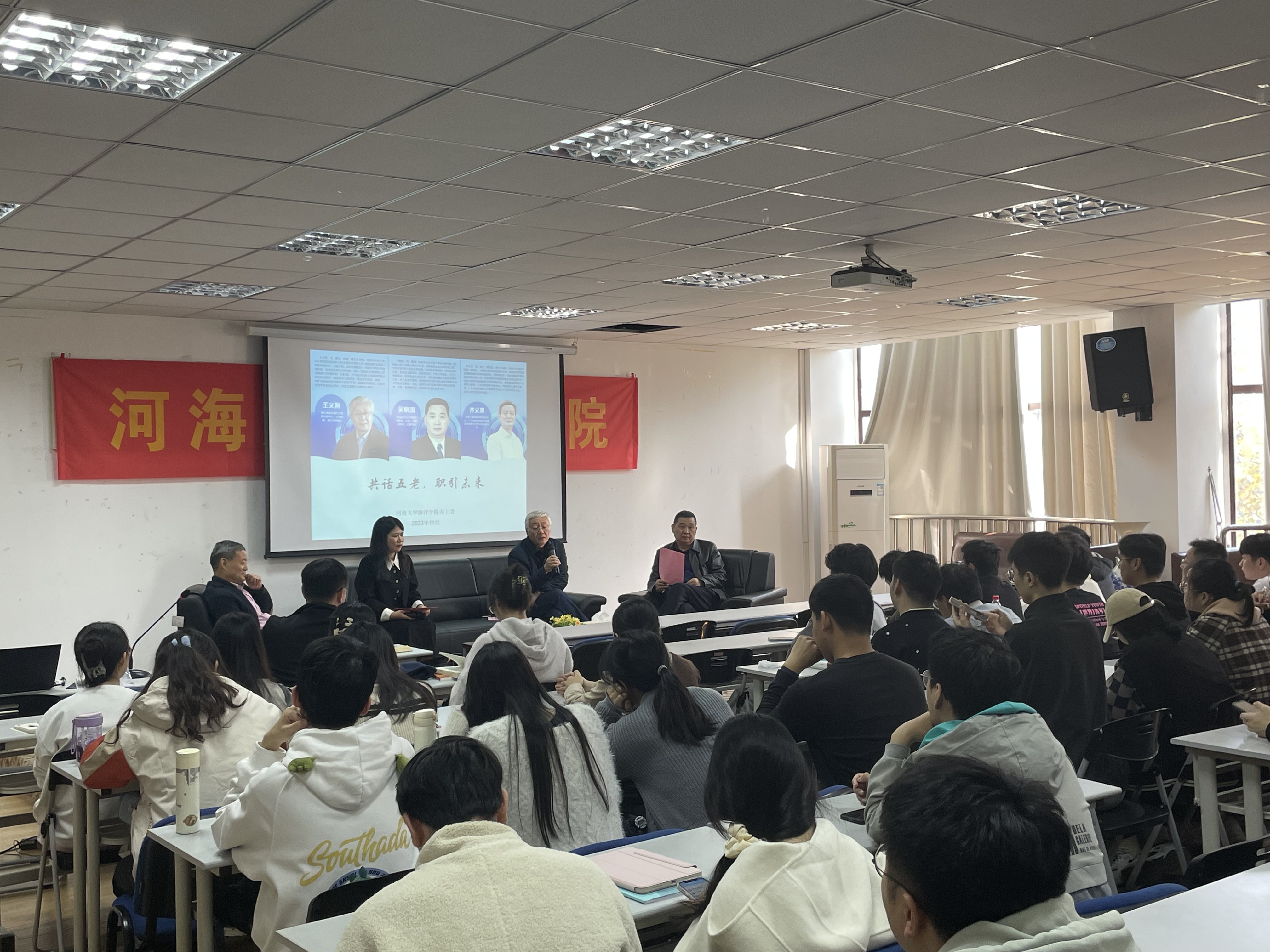 20231121日,下午14:15,黄瓜视频 “共话五老,职引未来”职业生涯访谈活动在西康路校区电气馆507成功举办。本次活动特邀海洋水文1982届校友吴朝国教授、1982届校友王义刚教授、黄瓜视频 首任院长1987届校友齐义泉教授三位嘉宾和同学们面对面交流,共话海洋人的职涯。