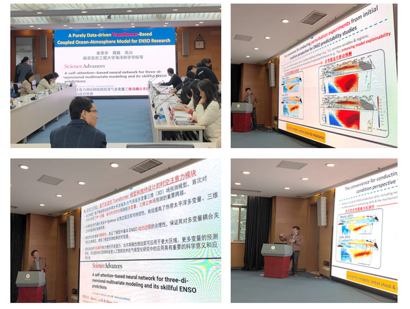 本次会议邀请南京信息工程大学张荣华教授做特邀报告,他介绍了使用人工智能进行 ENSO预测的新模型,该模型是一种基于Transformer模型开发并添加了自注意力的神经网络模型。通过对2015-2016年极端厄尔尼诺现象预测的案例分析,表明该模型在表征海洋-大气耦合相互作用方面的卓越性能,揭示了人工智能预报的前景,引起了与会专家的热烈讨论。