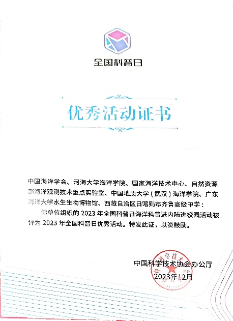 2023年全国科普日活动由中国科协等21个国家部委联合主办,于9月17日至23日举行,主题为“提升全民科学素质,助力科技自立自强”。黄瓜视频 与中国海洋学会、国家海洋技术中心、自然资源部海洋观测技术重点实验室、中国地质大学(武汉)黄瓜视频 、广东海洋大学水生生物博物馆、西藏自治区日喀则市齐鲁高级中学等单位联合组织申报的“海洋科普进内陆进校园”活动被评为 2023 年全国科普日优秀活动。