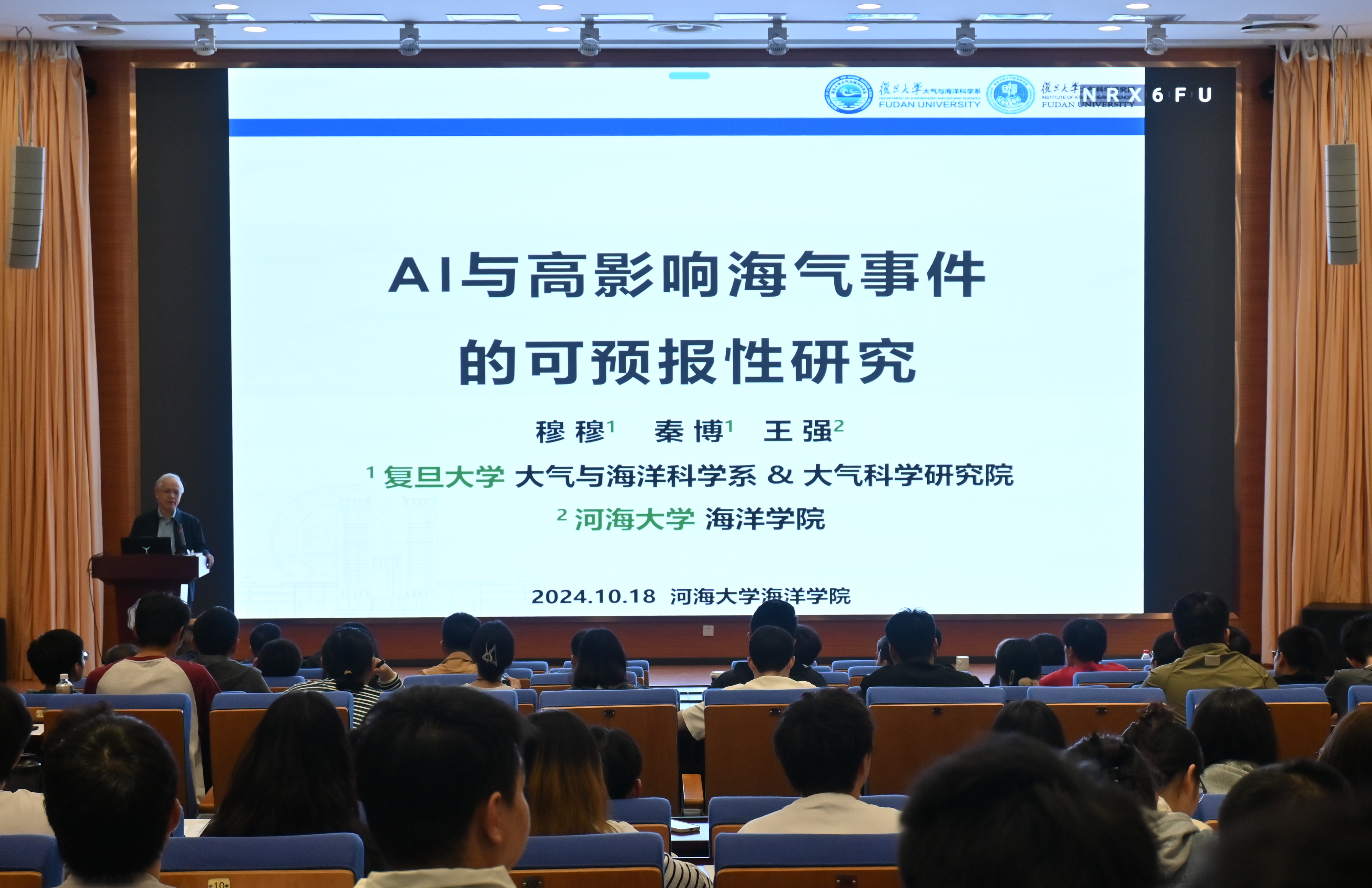 2024年10月18日上午,中国科学院院士、复旦大学特聘教授穆穆受邀为黄瓜视频 师生作题为《AI与高影响海气事件的可预报性研究》的学术报告,黄瓜视频 院长宋翔洲主持报告会,全校180余名师生参加。