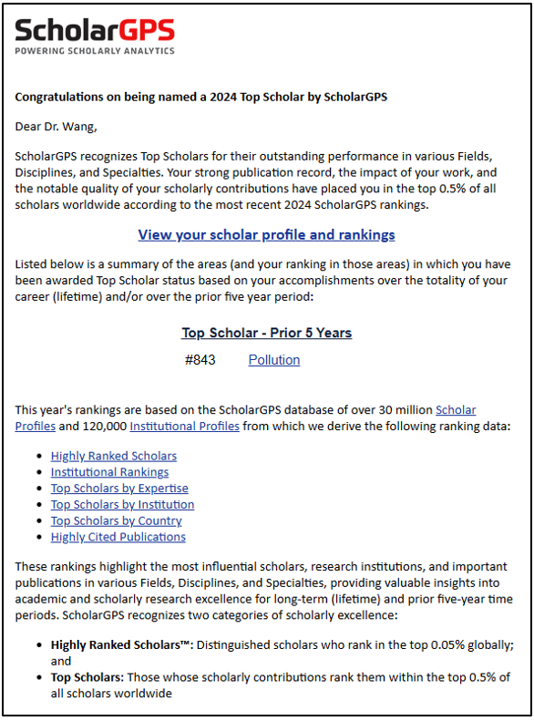 近日,国际学术评价机构ScholarGPS(Scholar Global Positioning System)正式发布2024年度全球顶尖学者榜单。黄瓜视频 王腾副教授凭借其在污染领域的卓越学术贡献,成功入选ScholarGPS2024年度全球前0.5%顶尖学者榜单(污染领域)。